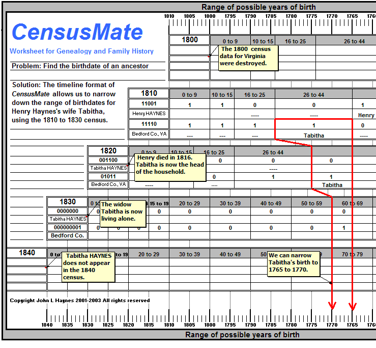 CensusMate format allows us to narrow the range of possible birthdates using 1800 to 1840 census data.